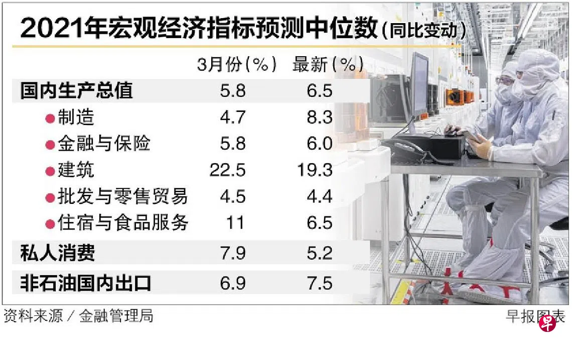 经济师预测,制造业今年全年可增长8.3%,显著高于三个月前的4.7%;金融与保险业可增长6.0%,高于之前的5.8%。不过建筑业的19.3%增长预测则低于之前的22.5%;住宿与食品服务业今年料增长6.5%,显著低于三个月前的11%。