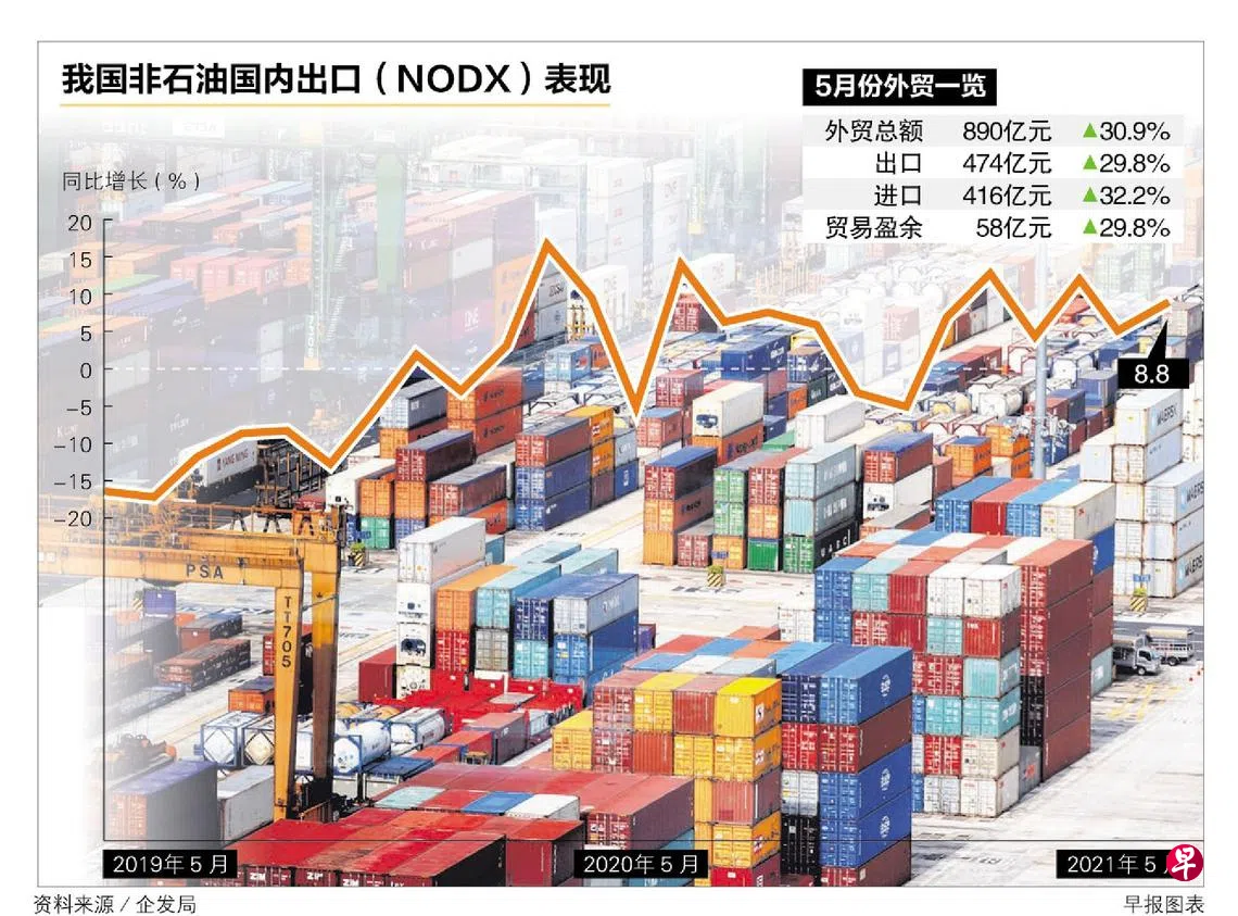 连升六个月但低于市场预期 5月非石油国内出口增长8.8%订户赠阅文章对于5月份非石油国内出口的表现,华侨银行经济师林秀心表示:“鉴于去年阻断措施期间的基数很低,这个表现低于市场预测的16.0%和我们预期的16.8%。高警戒解封第二阶段在今年5月中旬开始,恰逢全球冠病疫情再度升温,许多地方也收紧了边境和限制措施,这可能抑制了近期的国外需求。”王阳发 报道ongyh@sph.com.sg非石油国内出口冠病疫情新加坡企业发展局芯片半导体油价全球贸易上一篇创业家放手17年心血 办课程加强创业社群凝聚力下一篇颜金勇:鼓励公共私营合作 政府支持企业发展与转型购买此文章
