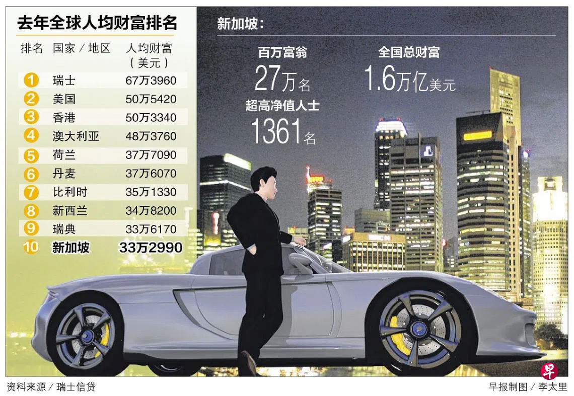瑞士信贷研究院(Credit Suisse Research Institute)昨日(6月22日)发布2021年全球财富报告,新加坡去年的总财富增加6.67%至1.6万亿美元(2.16万亿新元)。每名成年新加坡人的人均财富增加8.3%,达到33万2995美元,在全球排名第10。