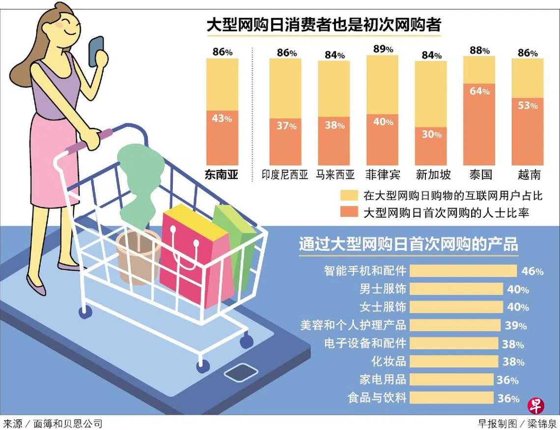 根据面簿(Facebook)和贝恩公司(Bain & Company)昨天(6月23日)发表的报告,受访的东南亚互联网用户当中,有86%在大型网购日网购,其中43%也表示这也是他们的首次网购经历。