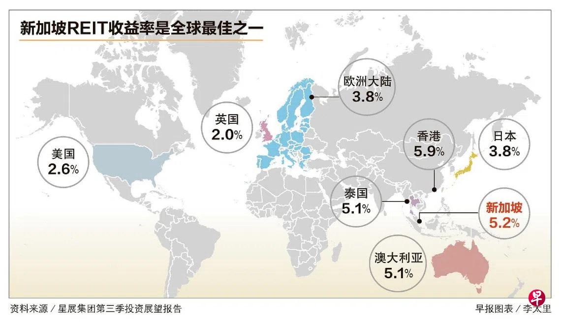 新加坡房地产投资信托(S-REIT)的股息收益率高达5.2%,是全球股息收益率最高的其中一个房地产信托市场。