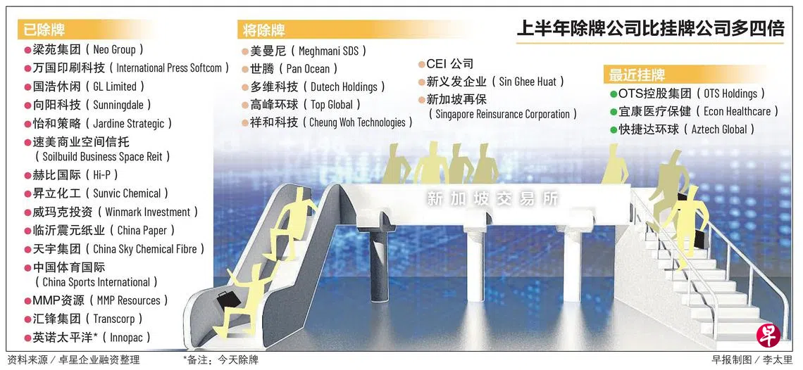 本地除牌风越刮越强,第二季有至少13家上市公司已经从新加坡交易所除牌,前一季则只有一家公司退市。相比之下,上半年只有三家公司在本地挂牌,显示除牌多过上市的情况依然严峻。
