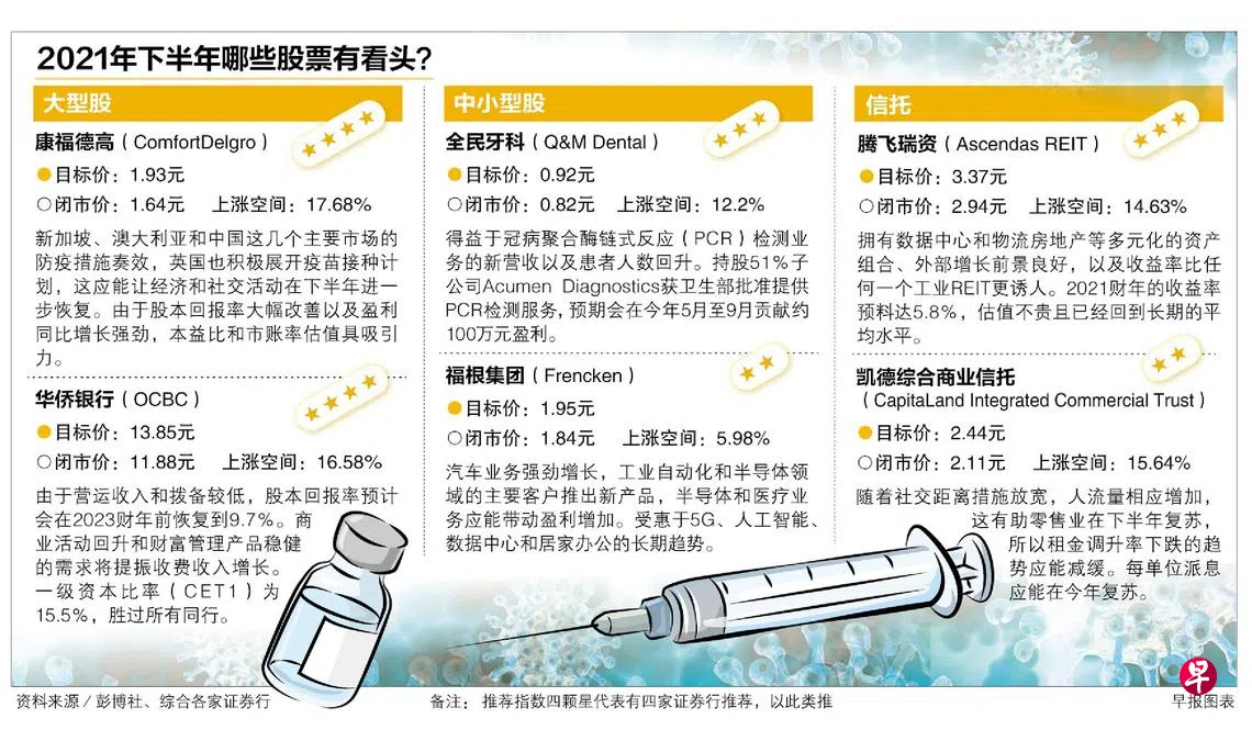 辉立证券研究部主管周冠龙说,一旦接种率提升至75%,出游和社交聚会的限制措施预期会进一步放宽,娱乐、餐饮和酒店业将因此受惠。若国际边界进一步重开,旅游股会受益。“我们看好本地三家银行,预计贷款增长和利息收益率的复苏将进一步推动股价上涨。”