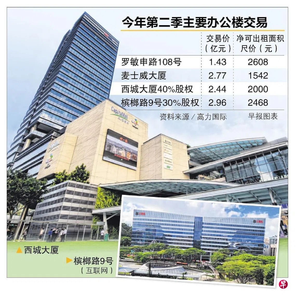 高力国际(Colliers)的最新报告显示,今年第二季完成的办公楼交易主要包括,PGIM房地产收购的罗敏申路108号商业大厦和新达信托(Suntec REIT)脱售槟榔路9号办公楼30%的股权给海逸控股(Haiyi Holdings)。本地发展商刘景发(Low Keng Huat)脱售西城大厦(Westgate Tower)40%的股权给Sun Venture Homes,再向Sun Venture Realty收购巴耶利峇广场(Paya Lebar Square)45%的股权,也是其中一项重要交易。