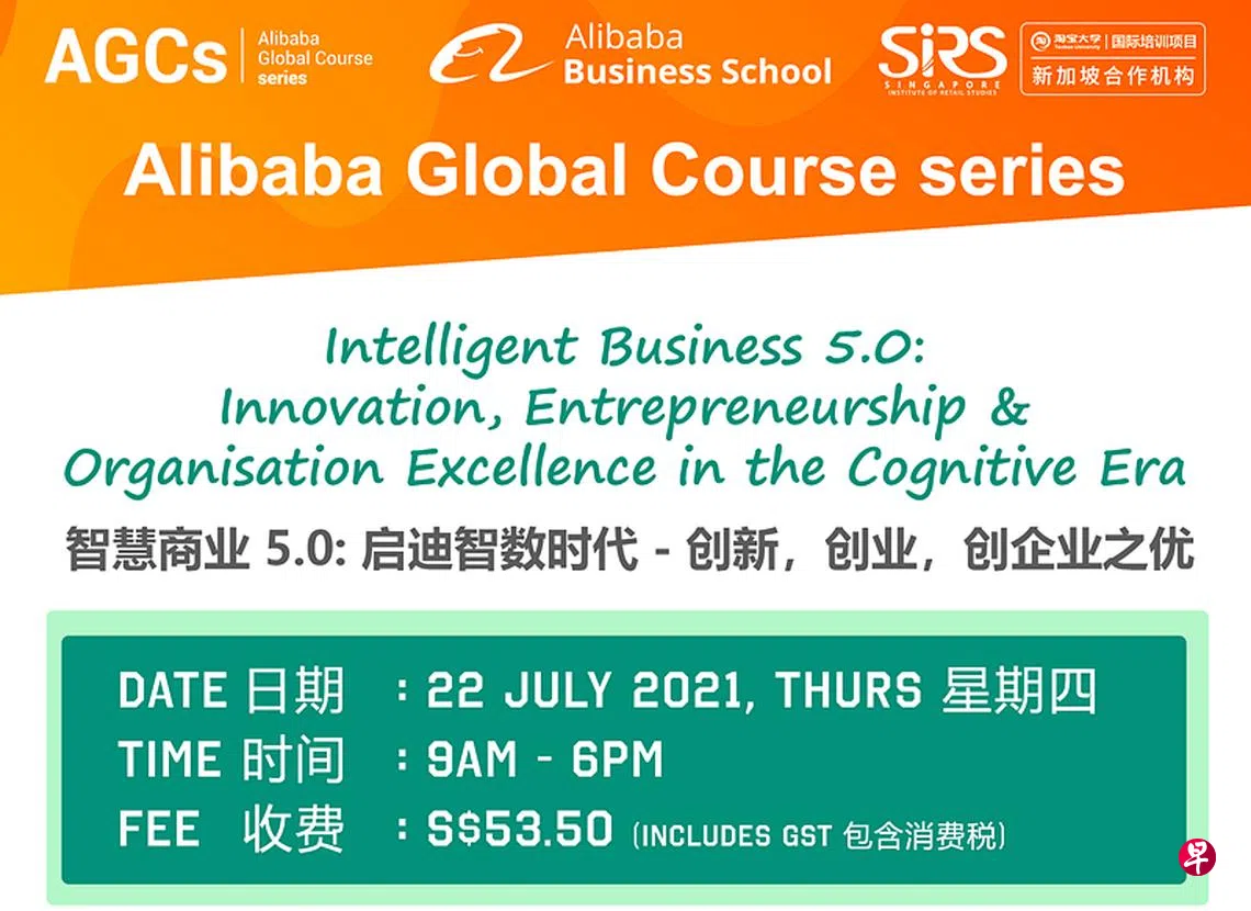 由新加坡零售管理学院(SIRS)和阿里巴巴商学院所推出的2021年阿里巴巴环球课堂(Alibaba Global Course)系列,将在7月22日上午9时至傍晚6时在线上以华语进行,向企业介绍如何从工业4.0到智慧商业5.0智慧数码化转型,从旧思路的智能操作到破局的智数新生态。