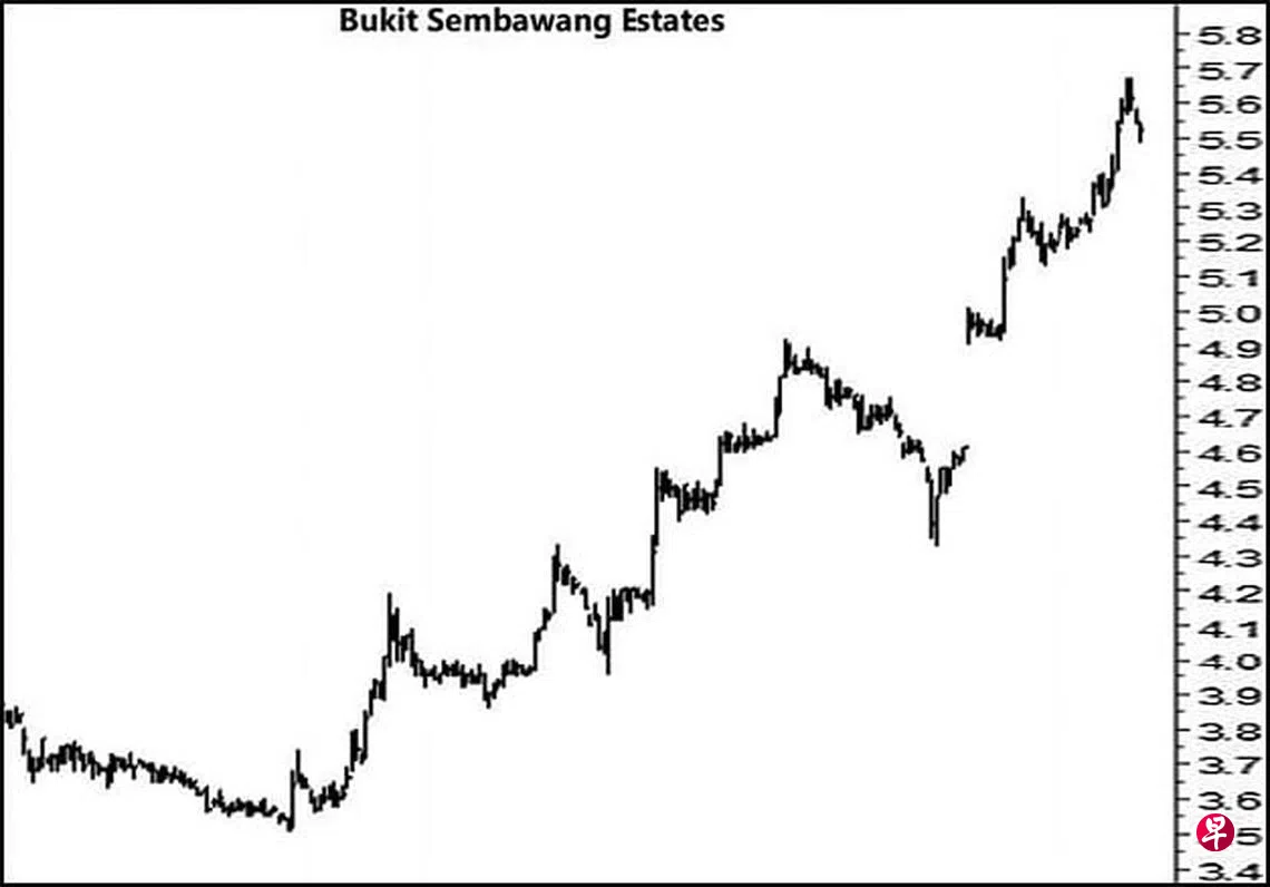 本栏于今年4月21日曾论及这只股票短期调整在即,向下填补介于4.47元与4.45元及介于4.33元与4.31元的缺口,也就理所当然。当时股价为4.77元左右。果然,股价过后渐渐下滑,见报当天股价一度下试4.65元。5月5日股价下跌至4.58元,由于跌势甚骤,造成介于4.62元与4.65元间出现缺口。5月12日股价跳空下探4.51元,又在介于4.55元与4.57元间留下缺口。5月14日股价下试4.35元,随即将上述第一个缺口填补。17日股价更下跌至4.33元,并于当天以“转向”信号止跌回升。5月27日股价跳空上升至5.01元,由于升势很猛,不但将上述第四及第三个缺口填补,同时在介于4.91元与4.61元间留下一个巨大缺口。5月31日股价终于以4.96元闭市,旋于其每月一杆图以“主要转向”信号带领股价继续上升。截至7月16日股价已经上升至5.67元了。由于其每月一杆图中的“动力”信号已经上升至负号界域的0.06047处,随时会穿上“中性线”而进入正号界域,迄时股价或将试位于5.87元的阻力线了。
