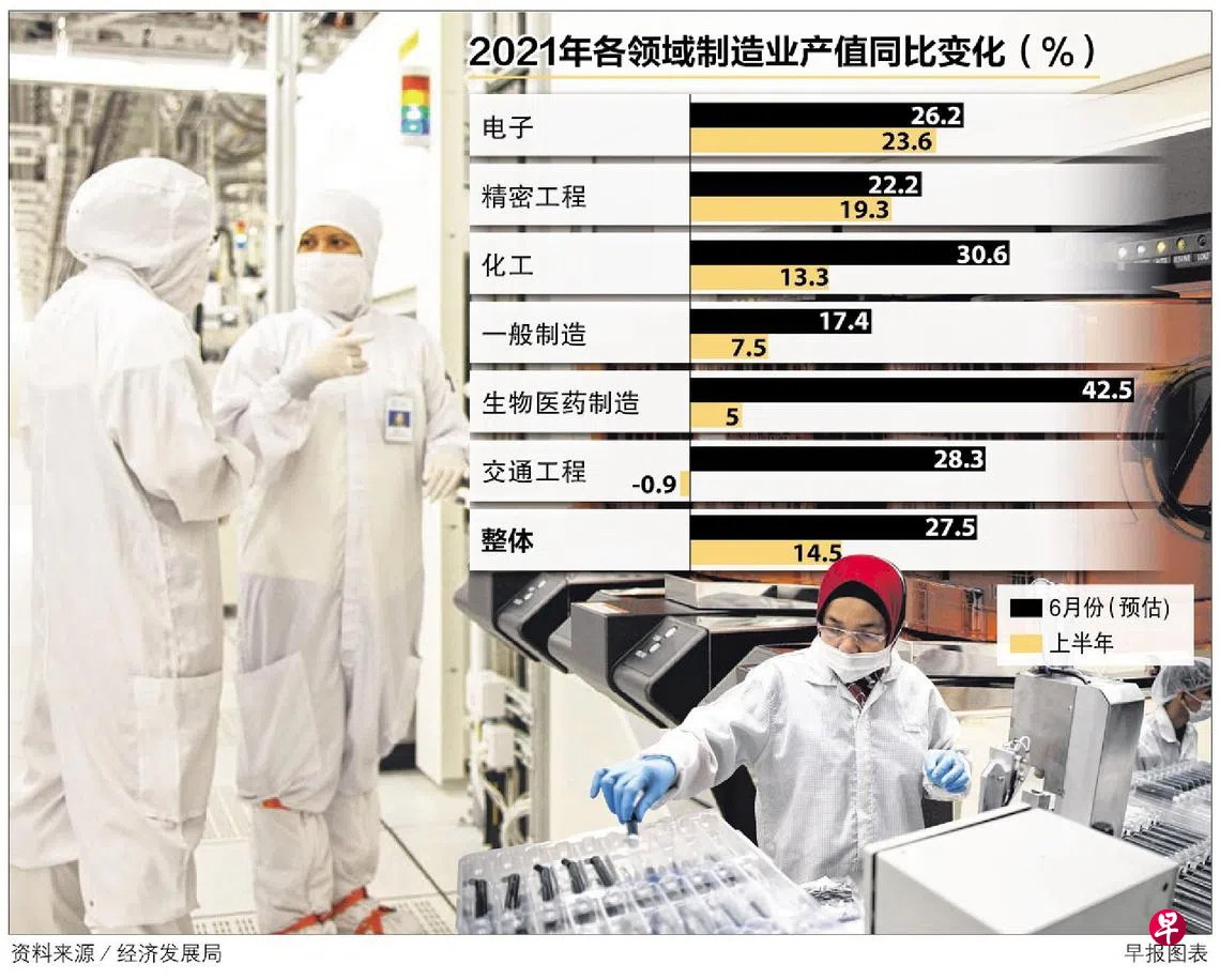 新加坡制造业持续强劲,6月份制造业产值同比增长27.5%,符合经济师预期。这是我国制造业产值连续第八个月扩张,创下2010年11月以来最快增速。