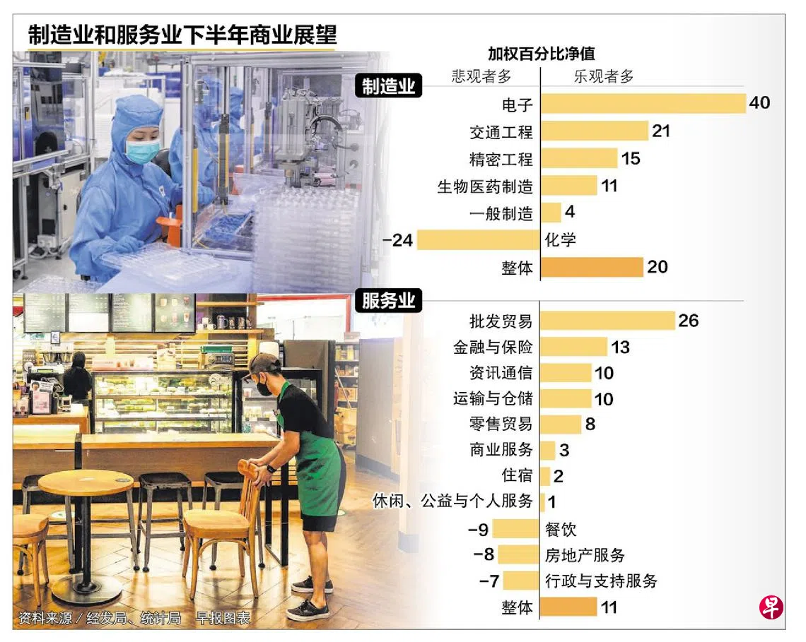 另外,新加坡统计局针对服务业者展开的第三季商业展望调查报告显示,20%的本地服务业者预期下半年商业情况好转,9%则认为情况将变坏,结果与上一季相同。