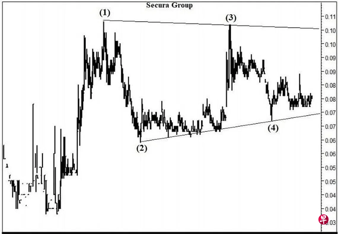 这只股票于2016年元月28日上升至0.255元后,随即进入五波下跌走势。同年6月3日股价下试0.15元,并于每月一杆图以“主要转向”信号完成第(1)波。同年10月20日股价回升至0.23元,此为第(2)波。2018年10月2日股价一度下探0.06元,过后于每周一杆图以“主要转向”信号结束了第(3)波。接着又于每月一杆图以“主要转向”信号带领股价回升,且于2019年4月5日升试0.087元完成了第(4)波。2020年3月9日股价下跌至0.038元,遂于每月一杆图以“主要转向”信号结束了第(5)波,立即止跌回升。同年7月7日股价升至0.108元,过后渐渐形成一个升势“三角形”。同年9月15日股价回扯至0.064元,并于该周每周一杆图以“主要转向”信号完成图中的第(2)点,接着回升至今年3月1日的0.107元结束了第(3)点。5月17日股价下试0.072元,且于当天以“转向”信号完成第(4)点。估计股价随时会突破位于0.105元的“三角形”上限,朝0.15元目标前进。