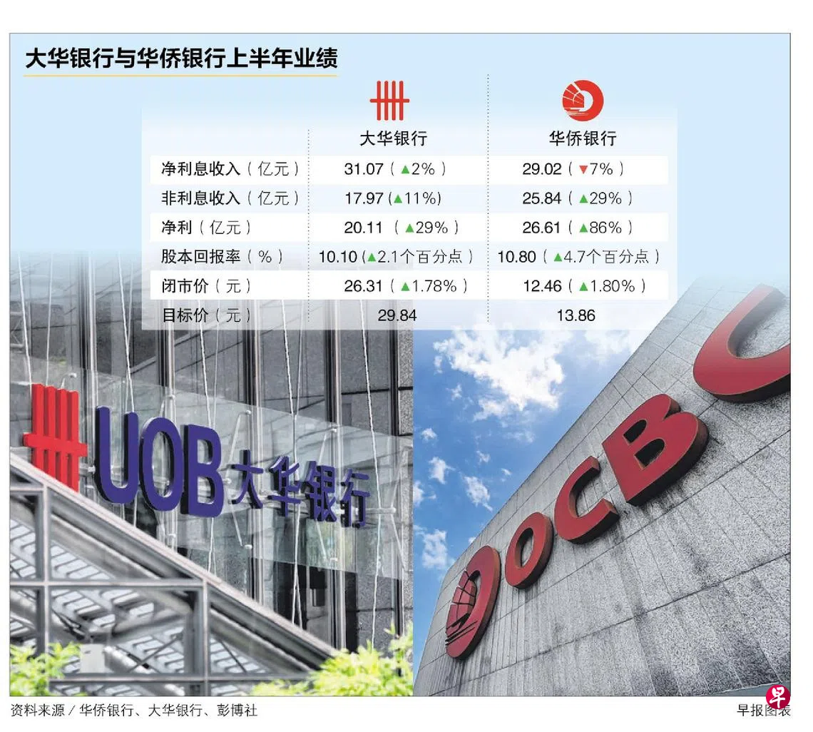 华侨银行与大华银行第二季和上半年净利皆取得双位数增长。随着新加坡金融管理局取消派息限制,两家银行都宣布派发比去年同期更高的股息。