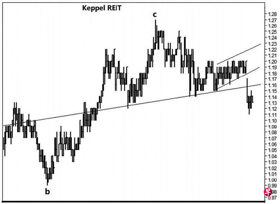 本栏于今年5月7日曾论及这只股票截至3月29日股价已经上升至1.27元,随时会朝1.33元的阻力点前进。当时股价为1.20元左右。见报当天股价一度升试1.24元,无奈力不从心,竟于当天以全天最低的1.21元闭市而成了“转向”信号,过后缓缓下跌,因此,其三波回扯中的c波也就在3月29日的1.27元结束了。5月14日股价下跌至1.14元,21日又再下试1.14元“头肩形”的颈线。6月9日股价上升至1.20元,16日经过第六度试1.20元的价位未果,随即以“转向”信号回落。17日下跌至1.15元,又经过四次下探此价位未果,6月22日终于以“主要转向”信号在介于1.15元及1.20元这两条平行线间缓缓上升。8月3日股价骤然跳空下试1.13元,同时在介于1.17元与1.20元间留下缺口。5日股价更下探1.11元,信号当天以“转向”信号止跌回升。估计股价短期回扯当尝试填补上述缺口,过后重返跌势。若以图中“头肩形”的高,计自位于1.15元的颈线,可测得基本目标为1.01元了。