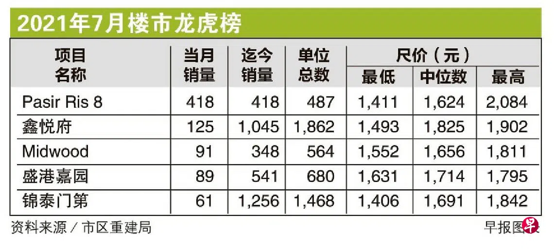 7月份唯一开盘的白沙新综合项目Pasir Ris 8热销,成为该月新私宅销售冠军,并引发溢出效应,带动其他项目销量显著上扬。