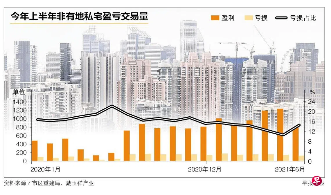 根据地产咨询公司戴玉祥产业(Edmund Tie)发表的今年第二季私宅销量报告,亏损私宅在今年3月占转售交易总量的14%,但4月和5月份转售私宅的利润却上升,亏损的私宅一度在5月份减少到10.5%,创下新低。