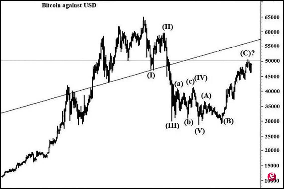 本栏于今年6月1日曾论及比特币已经在今年4月14日的64899.97美元为第(5)大波画下句号,旋以一个“头肩形”下跌。截至5月19日比特币已经下跌至30000.00美元,估计艰辛的回扯已经开始,且当试50131.67美元的“颈线”后,重返跌势。当时比特币为35208.54美元左右。可是比特币并没有立即回扯,而是继续下滑至5月30日的33420.00美元后,才于当天以“转向”信号止跌回升。6月3日比特币升试39488.05美元,旋出现调整。6月8日比特币下探31025.00美元完成了图中的(b)波,接着上升至6月15日的41323.06美元顺利结束了(c)波,同时为图中的第(IV)波画下句号。6月22日比特币猛挫至28800.01美元,且于当天以“转向”信号结束了第(V)波,遂进入三波回扯。6月29日比特币升试36604.25美元完成了(A)波,过后回落至7月20日的29283.97美元,此为(B)波。8月23日比特币上升至50530.51美元完成了上述50131.67美元的基本目标,估计(C)波回扯随时会结束,迄时比特币将下试位于29283.97美元的支撑点了。