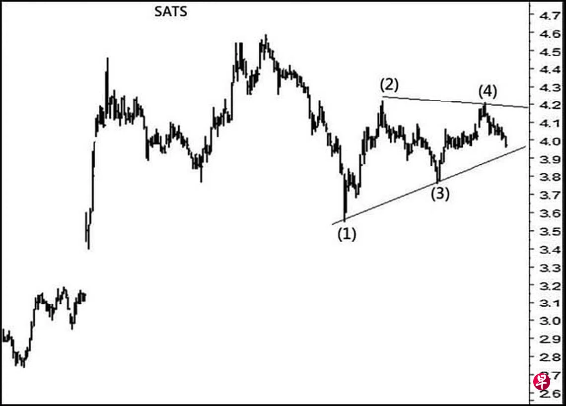本栏于今年6月3日曾论及这只股票短期回扯,或将填补介于4.09元与4.10元间的缺口,过后向下填补介于3.54元与3.53元及介于3.40元与3.14元的缺口。当时股价为4.03元左右。果然,股价过后渐渐上升。6月9日股价上升至4.15元,随即将上述第一个缺口填补。6月11日股价更升试4.22元,并于当天以“主要转向”信号完成了图中一个跌势“三角形”的第(2)点,接着以三细波下调。7月19日股价下跌至3.83元,由于跌势甚急造成介于3.89元与3.91元间出现缺口。7月21日股价下试3.76元结束了第(3)点,旋止跌回升。7月23日股价上升至3.93元,遂将上述第四个缺口填补。8月25日股价上升至4.21元,且于当天以“转向”信号结束了第(4)点后,渐渐回落。截至9月8日股价已经下跌至3.96元。由于其每日一杆图中的“动力”信号已经下移至0.05680处,随时会跌穿“中性线”而进入负号界域。迄时当带领股价跌穿位于3.92元的“三角形”下限,填补上述第二及第三个缺口也就水到渠成。