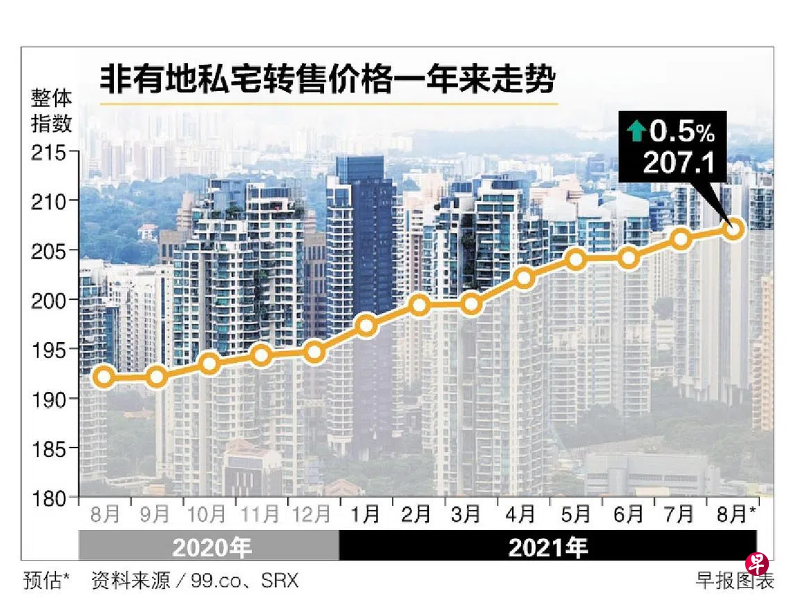 根据房地产网站99.co和SRX昨天发布的预估数据,8月本地非有地私宅转售价格同比上升7.9%。今年以来,非有地私宅转售价格已上扬6.4%。