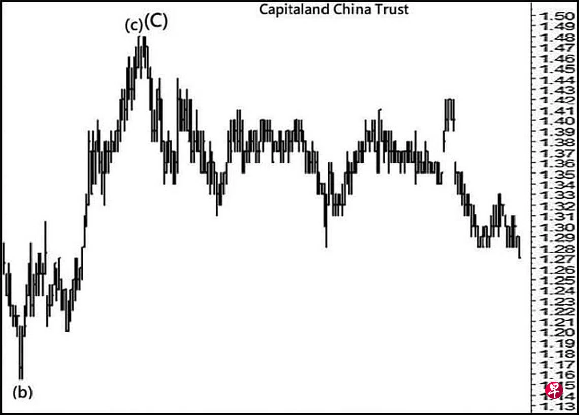 本栏于去年4月24日曾论及这只股票短期内股价将下跌,以填补介于1.17元与1.13元间的缺口。当时股价为1.24元左右。可是股价并没有立即向下填补上述缺口,主要原因是图中的(A)波已经在4月9日的1.41元价位上完成,而(B)波又具三波走势。4月22日股价下试1.22元结束了a波,过后回扯至同年6月9日的1.40元,且于当天以“主要转向”信号完成了b波。同年9月22日股价下探1.095元终于将上述缺口填补,不但结束了c波,同时也为(B)波画下句号,遂进入具三波的(C)波升势。同年10月13日股价上升至1.30元完成了(a)波;11月2日股价回落至1.155元,此为(b)波。今年元月20日股价上升至1.48元,旋于其每周一杆图以“转向”信号结束了(c)波,同时也为(C)波画下句号,随后进入跌势。截至9月15日股价已经下探1.27元。估计短期回扯有限,股价一旦跌穿位于1.155元的支撑点,则向下填补介于0.995元与0.98元的缺口当无悬念。