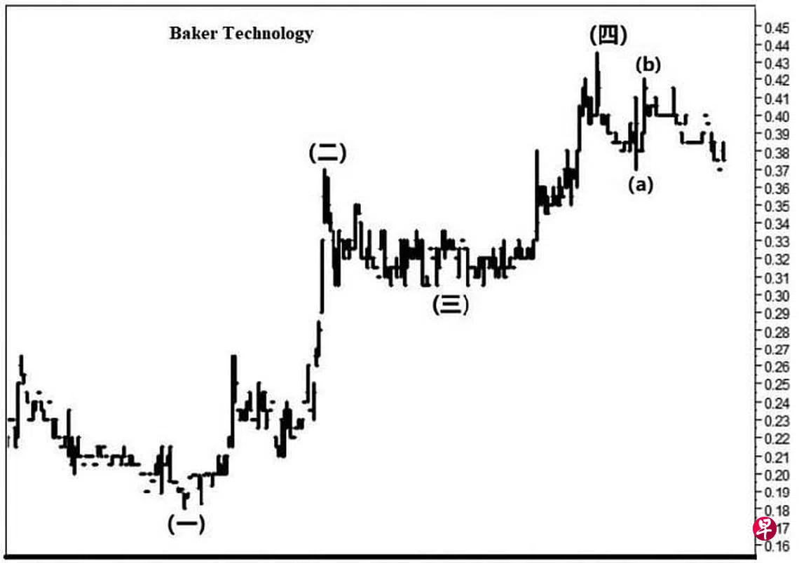 本栏于今年6月25日曾论及这只股票回扯至4月6日的0.305元,结束了一个升势“斜向交叉”的第(三)点。估计股价当时正处第(四)点升势,且当挑战0.53元的阻力线以进入中期升势。当时股价为0.355元左右。见报当天股价仅略微上升至0.38元。7月6日股价一度升试0.435元随即转而回落,并于该周每周一杆图以“转向”信号完成了上述的第(四)点,过后更于每月一杆图以“转向”信号带领股价进入第(五)点回扯。7月27日股价下滑至0.37元,旋于当天以“主要转向”信号结束了上图中的(a)波,接着回升至8月2日的0.42元,此为(b)波。8月3日股价跳空下试0.40元,截至9月15日股价已经下滑至0.37元。估计股价随时会将介于0.36元与0.355元及介于0.345元与0.34元的缺口填补以完成(c)波。毕竟其每月一杆图中的“动力”信号已经上升至负号界域的0.07319,随时会穿上“中性线”而进入正号界域,迄时将带领股价进入中期升势,且将填补介于0.53元与0.54元间的缺口了。