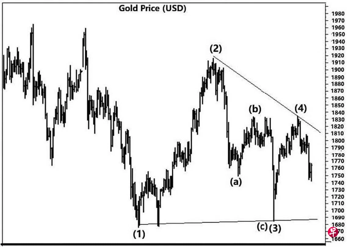 本栏于今年3月23日曾论及金价回扯有限,毕竟位于1822.44元及1851.02元的阻力线仍然存在;相反的,金价一旦跌穿位于1570.57元的支撑线,将有骤跌。当时金价为1744.74元左右。可是金价并没有立即回扯,而是渐渐下滑至3月31日的1677.61元后止跌回升。5月6日金价骤然上升至1817.90元,7日金价终于穿过上述第一条阻力线直抵1842.91元。5月13日金价略微下调至1808.44元,旋于当天以“转向”信号重返升势。5月17日金价急速穿过上述位于1851.02元的阻力线直试1868.26元的价位。截至6月1日金价已经上升至1916,40元,遂于当天以“主要转向”信号完成了上图中一个跌势“三角形”的第(2)点,过后进入三波下调。6月29日金价下跌至1749.20元结束了(a)波,随即回扯至7月15日的1833.65元,此为(b)波。8月9日金价下探1684.37元完成了(c)波,同时为第(3)点画下句号;9月3日金价回升至1833.80元结束了第(4)点。因此,若以上图中“三角形”的高,计自位于1687.12元的下限,可测得基本目标为1454.04元了。