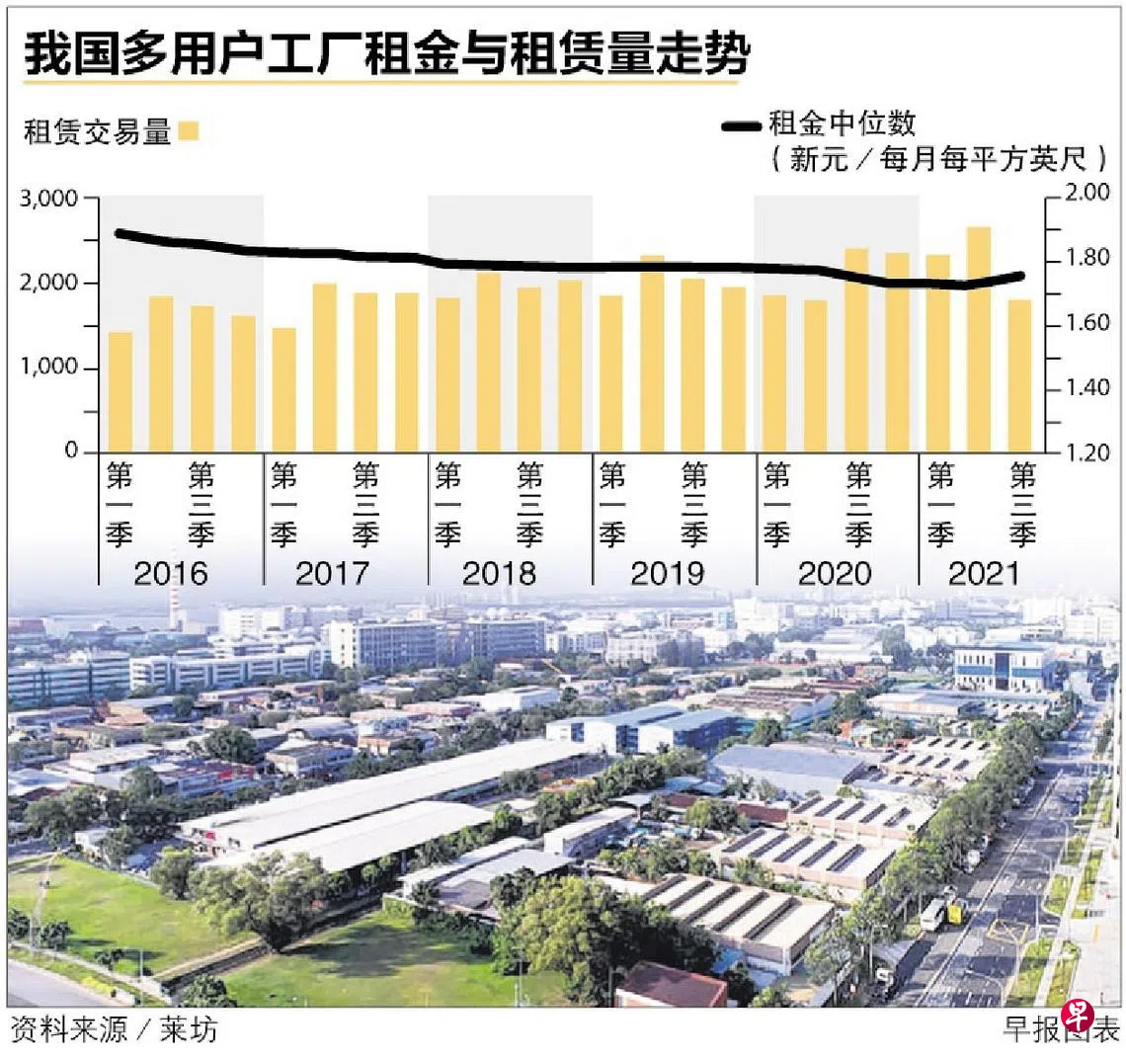 莱坊资本市场部国际房地产与工业物业主管陈彦旭说,今年第三季全岛多用户工厂(multiple-user factory)租金中位数首次上升。这是该类别厂房租金两年来首次回升,季对季增幅为1.6%,每月每平方英尺1.80元。