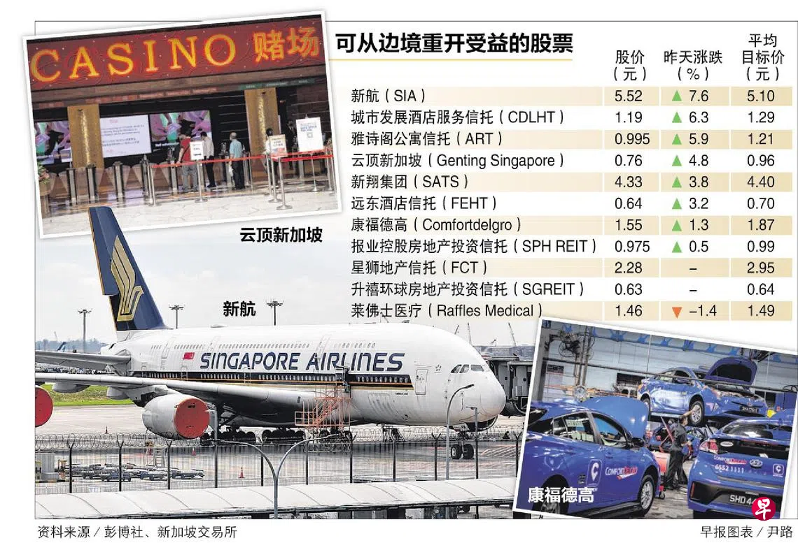 随着政府周六(10月9日)宣布进一步开通疫苗接种者旅游走廊,分析师指出,新加坡加紧开放边境,之前最受疫情冲击的航空股、酒店股、交通股和旅游相关股等将显著受益。