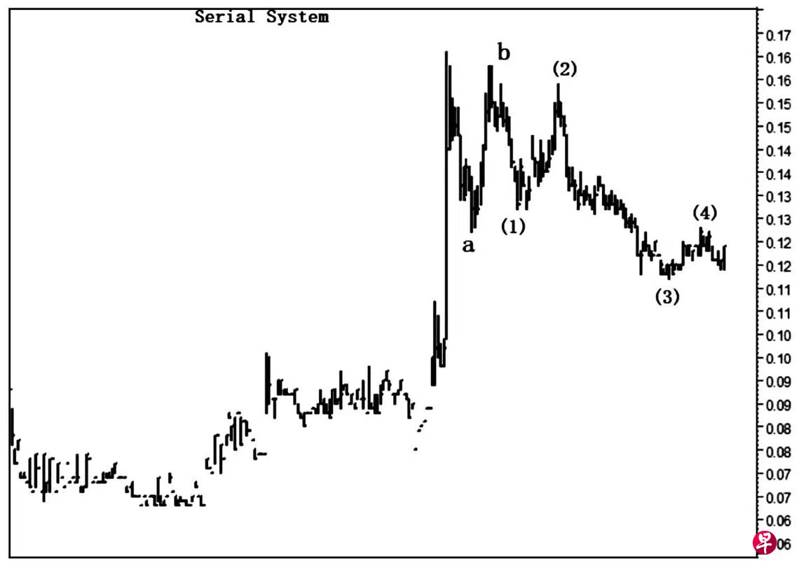 本栏于今年7月15日曾论及这只股票短期回扯有限,充其量也只能尝试填补介于0.094元与0.08元间的缺口,一旦突破0.21元的阻力线,股价当有可观的升幅。当时股价为0.151元左右。果然,股价过后渐渐下滑,7月21日股价下试0.132元完成了源自今年7月6日从0.163元具五波的c波下跌以来的第(1)波。次日,股价骤升至0.143元,无奈力不从心,7月26日股价再次下试0.132元的价位未果,随后于7月28日跳空上升至0.148元,同时在介于0.143元与0.136元间留下缺口;7月30日股价回落至0.137元,几乎将此缺口全予填补,过后一路挺升。8月11日股价上升至0.159元结束了第(2)波,旋进入第(3)波跌势。8月16日股价骤然下试0.139元,遂在介于0.148元与0.15元间留下缺口,由于第(3)波又具五细波,几经波折,股价终于10月5日下探0.117元完成了第(3)波;接着回扯至10月20日的0.128元,此为第(4)波。估计股价短期内当继续下滑以填补上述第一个后,重返升势。