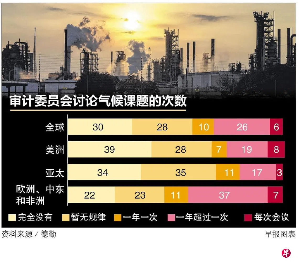 会计事务所德勤(Deloitte)针对40个国家的350个审计委员会成员调查显示,从整体来看,有一半的受访者不认为自己有足够的能力履行与气候有关的监管职责。此外,近60%的委员会完全没有讨论或不定期讨论气候课题,认为自己不熟悉气候课题的委员会占47%。在亚太企业当中,这类审计委员会分别占69%和59%。