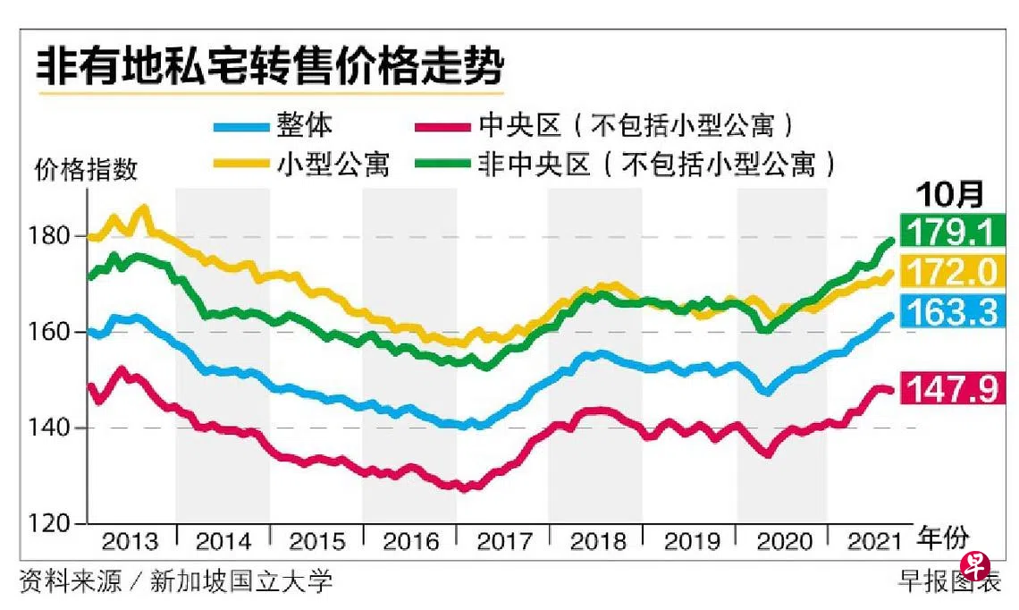 新加坡国立大学房地产与城市研究院(IREUS)发布的10月份房地产价格指数(NUS SRPI)预估数据显示,整体非有地私宅转售价格指数为163.3。
