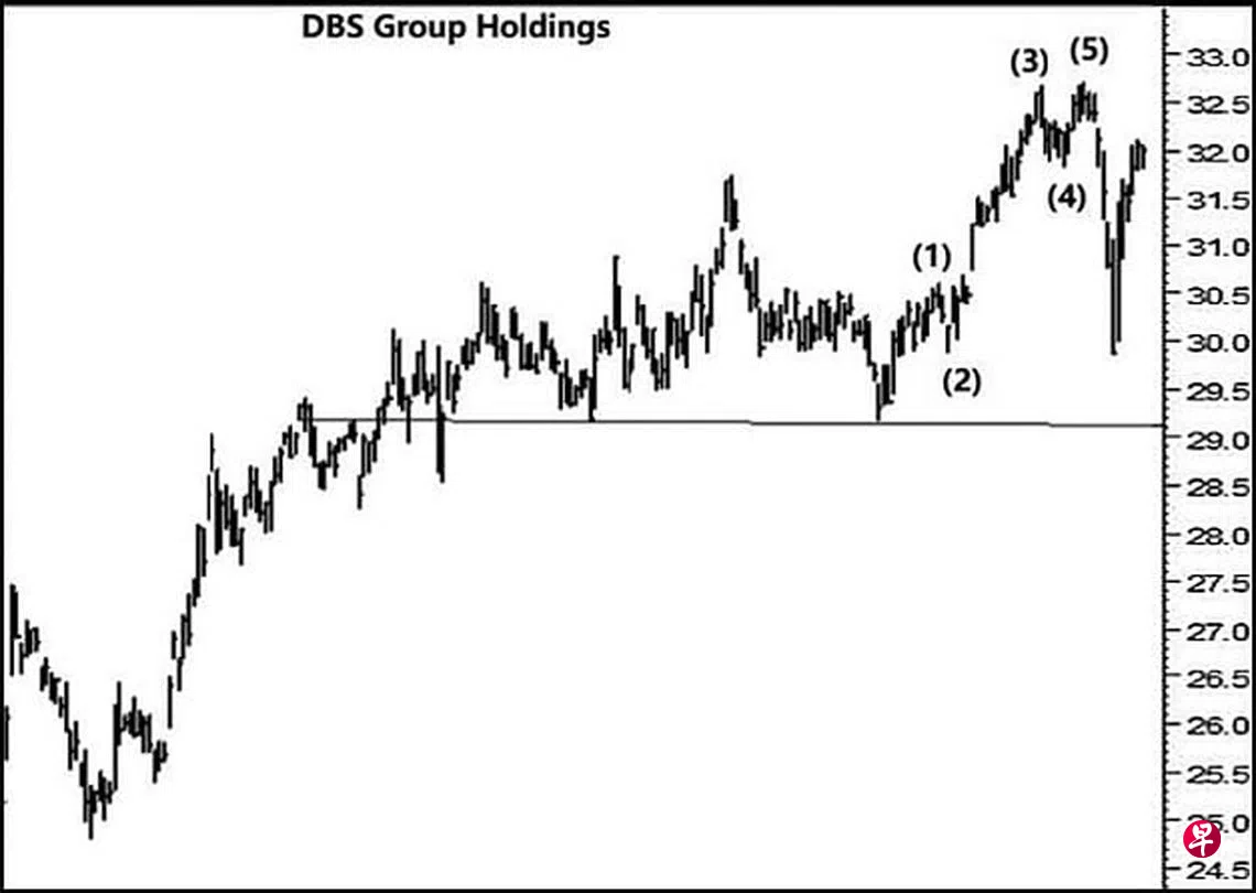 本栏于今年10月13日曾论及这只股票当时正处“右肩”回扯,一旦结束,股价当跌穿位于29.14元的颈线。若以该“头肩形”的高,计自上述的颈线,可测得基本目标为26.55元。当时股价为30.25元左右。见报当天股价骤升至30.56元,同时在介于30.20元与30.13元间留下缺口;次日,股价回调至30.03元,遂将此缺口填补。10月19日股价腾空直试31.22元,接着一路挺升,11月9日股价升试32.68元,旋于当天以“主要转向”信号为一个源自今年9月22日从29.18元上升以来五波中的第(3)波画下句号。11月16日股价下试31.83元,此为第(4)波,11月22日股价上升至32.70元,无奈强弩之末,竟于该周每周一杆图以“主要转向”信号完成第(5)波,过后又于其每月一杆图也已“主要转向”信号进入跌势。11月30日股价一度下探29.87元,由于跌势甚急,造成介于31.25元与31.57元及31.99元与32.11元间出现缺口。12月7日股价回扯至32.11元,遂将上述第二及第三个缺口填补。估计股价一旦跌穿位于29.14元的支撑线,当出现骤跌。