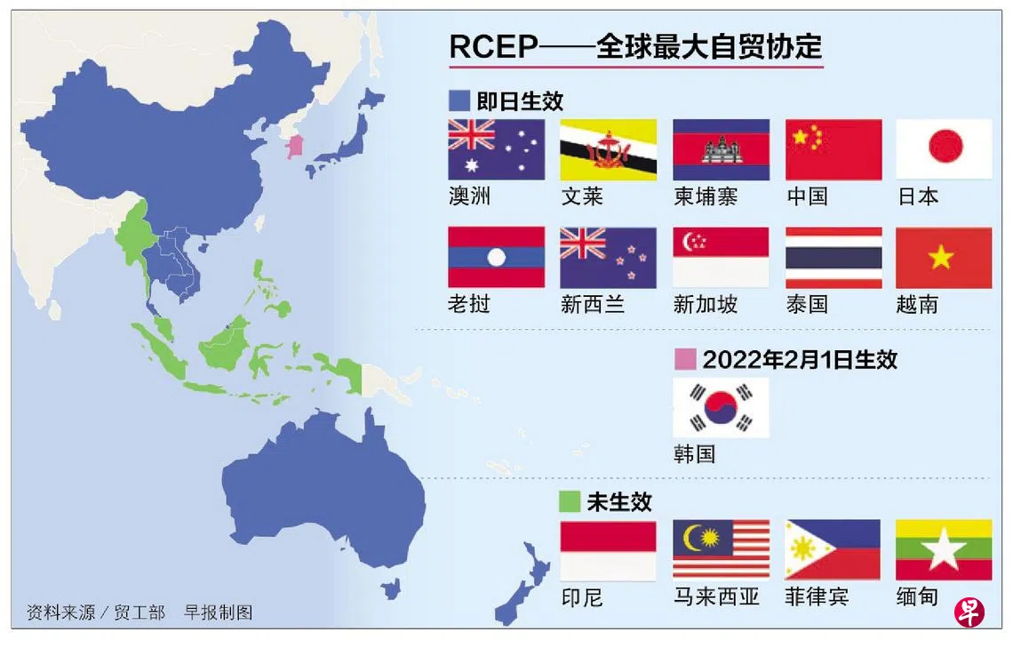 贸工部长颜金勇在文告中表示,协定生效将促进新加坡与RCEP缔约国之间的贸易和商业联系。RCEP是迄今为止规模最大的自贸协定,成员经济体占全球国内生产总值约30%,覆盖世界30%的人口。