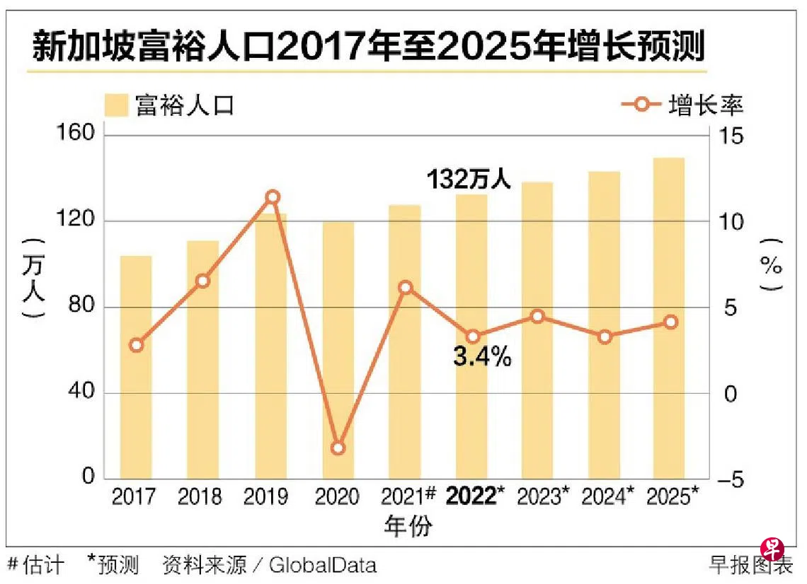 根据市场研究公司GlobalData预测,我国富裕人口今年预计增长3.4%至132万人,当中包括持有5万美元(6万8412新元)至100万美元(137万新元)流动资产的大众富裕投资者,以及持有100万美元以上流动资产的高净值人士。