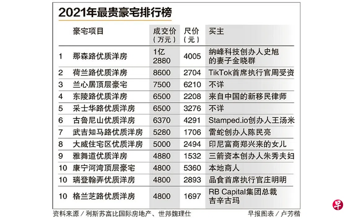 2021年最贵豪宅排行榜出炉。本地豪宅市场交易火热,优质洋房深受富豪青睐,新移民和科技新贵成主力买家。