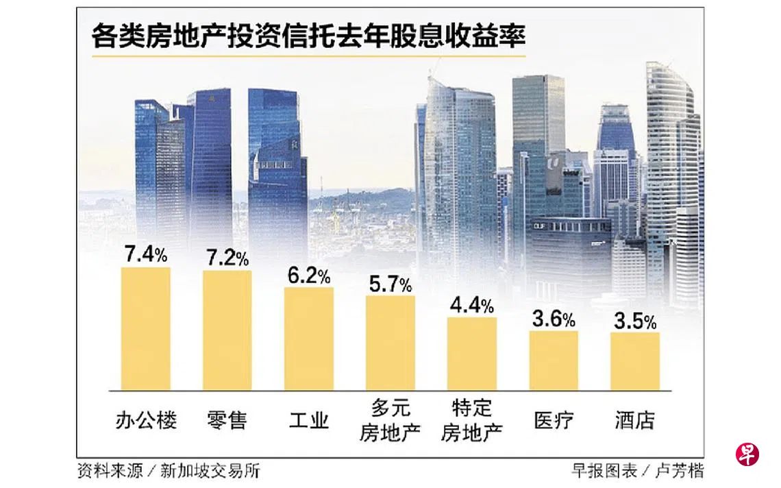 新加坡交易所(SGX)的最新报告显示,去年办公楼、零售商场和工业REIT的平均股息收益率最高,分别为7.4%、7.2%和6.2%。
