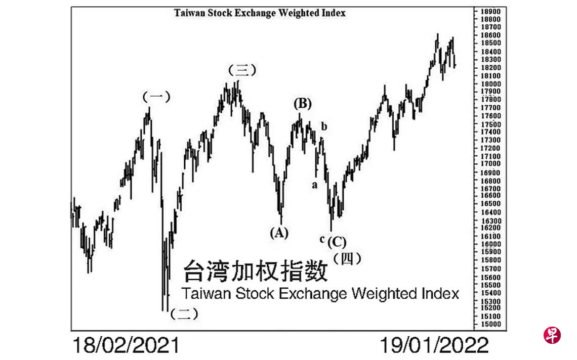 本栏于去年9月8日曾论及指数于同年8月20日的16248.08点,结束了一个“斜向交叉”的第(四)点。估计指数当继续上升,以填补介于17854.35点与17895.25点及介于17926.38点与18034.19的缺口,且将在18687.37点左右完成第(五)点后,才进入中期调整。当时指数为17495.30点左右。可是指数并没有继续上升而是以三波缓缓回落。9月22日指数骤然下探16838.58点完成了图中的a波,由于跌势甚急,造成介于17196.79点与17276.79点间出现缺口;9月27日指数回扯至17335.99点结束了b波,同时也将此缺口填补。9月29日指数跳空下试16801.78点,10月5日指数更下跌至16162.17点,且于当天以“转向”信号完成了图中的c波,同时也为(C)波画下句号,因此也替代了上述的16248.08点而成为第(四)点。11月19日指数上升至17986.18点填补了上述第一个缺口。12月24日指数更升试18039.85点,旋将上述第二个缺口填补。截至今年元月5日指数已经上升至18619.61点,几乎完成上述位于18687.37点的基本目标;因此,估计指数随时会为第(五)点画下句号,并出现调整。