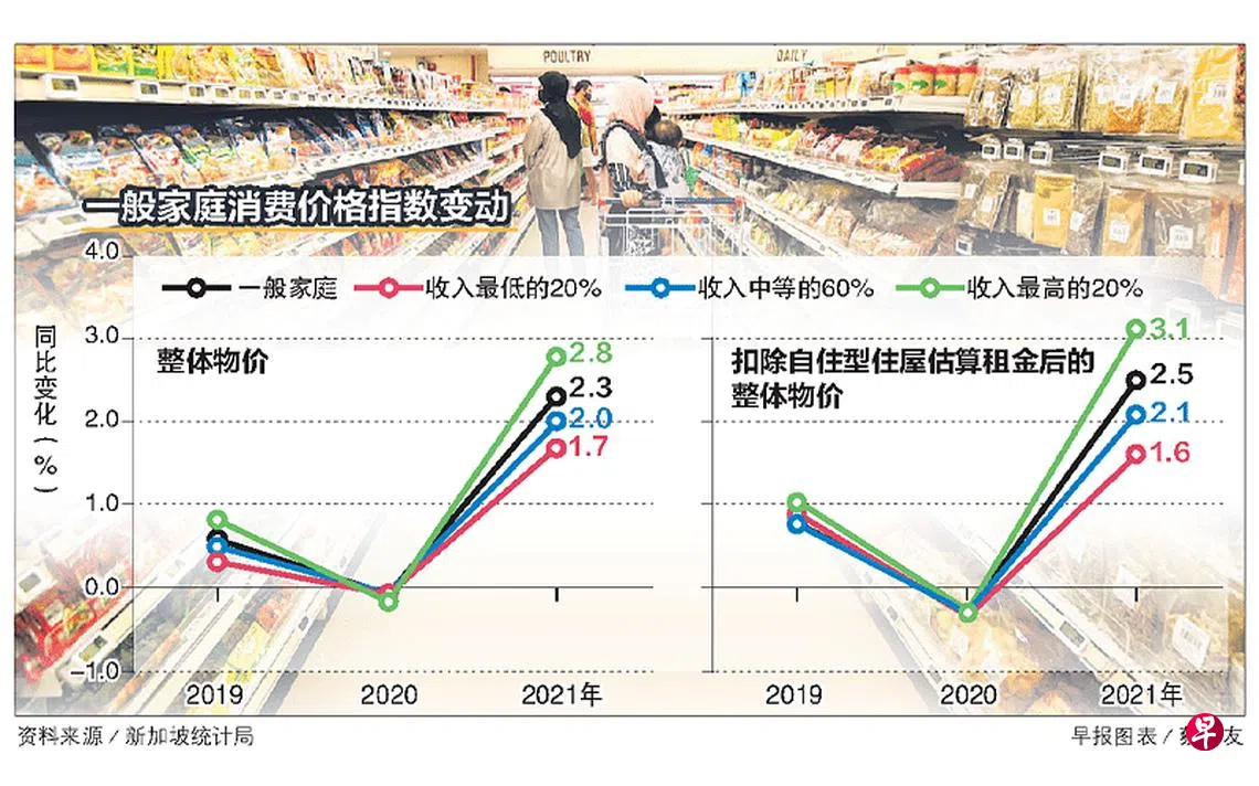 新加坡统计局昨天发布的文告显示,收入最高的20%国人,去年面对物价上涨2.8%;收入中等的60%国人,面对物价上涨2%。收入最低的20%国人则面对物价上涨1.7%。