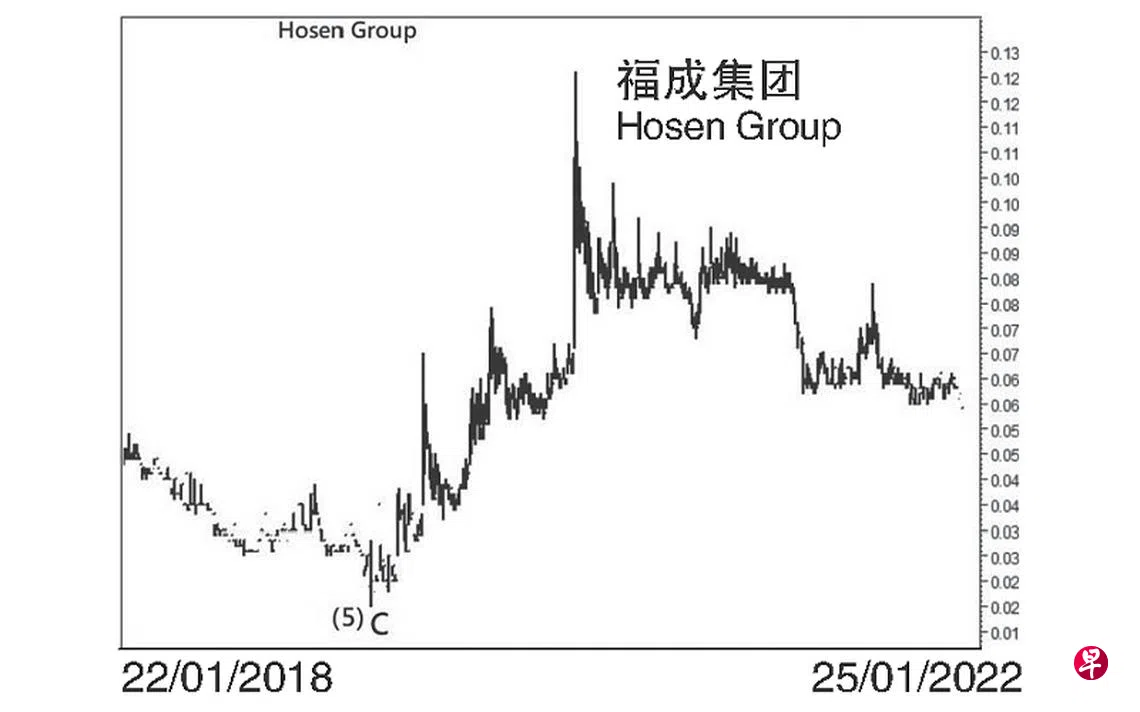 这只股票自2007年7月18日升试0.35元后,就进入三大波下调走势。2009年2月17日股价下跌至0.045元,并于其每月一杆图以“转向”信号完成了A大波,旋进入具三波的B大波回扯。同年19月26日股价上升至0.135元结束了(a)波;接着回落至2010年6月18日的0.075元,此为(b)波。2011年4月15日股价上升至0.14元完成了(c)波,同时也为B大波画下句号,遂进入具五波走势的C大波。2012年11月12日股价下跌至0.06元,且于当天以“主要转向”信号结束了第(1)波,过后回升至2013年2月21日的0.12元,此为第(2)波。2017年元月24日股价下试0.035元。旋于其每周一杆图以“主要转向”信号完成了第(3)波。2020年3月19日股价终于下探0.02元结束了第(5)波,同时为C大波画下句号,遂进入升势。去年1月26日股价上升至0.126元,若以此价位与上述0.02元价差的百分之61.8,计自0.126元,可测得回扯目标已经于今年元月25日的0.059元完成,估计股价随时会重返升势,并可能形成一个升势“斜向交叉”。