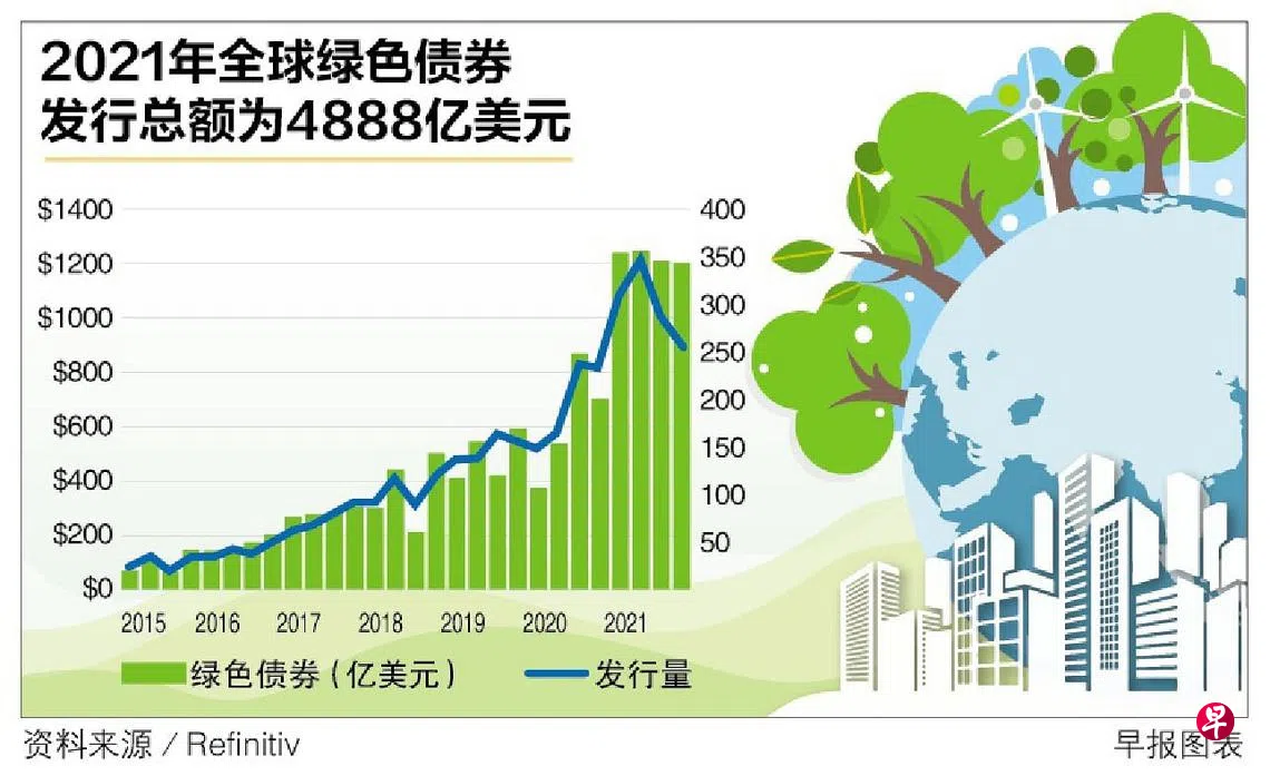 金融数据科技公司路孚特(Refinitiv)的数据显示,在2021年全年,绿色债券的发行总额为4888亿美元(约6565亿新元),几乎是2020年的两倍,并创下历来最高纪录。