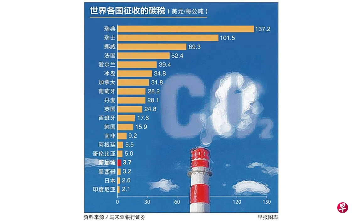世界银行的资料显示,全球有将近30个国家实施碳税,各个国家征收的税率差异极大。最高税率是瑞典的每公吨137美元(约186新元),最低是乌克兰的每公吨0.36美元。