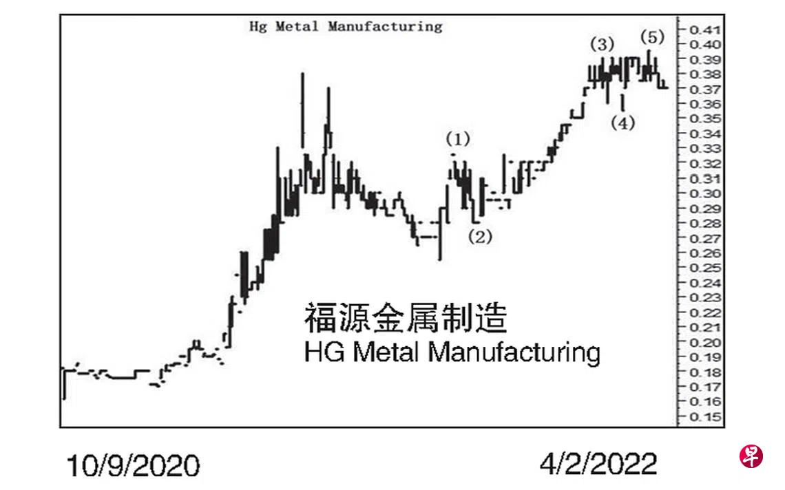 本栏于去年7月2日曾论及这只股票短期回扯,充其量也只能填补介于0.225元与0.22元的缺口,过后当重返升势。当时股价为0.285元左右。7月7日一度骤跌至0.265元,造成介于0.27元与0.275元间出现缺口。8月4日股价更下探0.255元,遂于当天以“主要转向”信号止跌回升至0.29元,旋将上述第二个缺口填补。8月16日股价上升至0.325元完成了图中的第(1)波,接着回扯至9月7日的0.28元,此为第(2)波。10月12日股价跳空升试0.32元,同时在介于0.32元与0.295元间留下缺口;13日股价回落至0.30元,随即将此缺口的一部分填补。12月10日股价骤然上升至0.385元,又在介于0.375元与0.36元间留下缺口。12月20日股价升试0.39元,并于当天以“主要转向”信号结束了第(3)波。12月22日股价下跌至0.36元,遂将上述第四个缺口填补。12月31日股价下探0.355元完成了第(4)波,今年元月20日股价上升至0.395元结束了第(5)波,旋进入调整。估计股价当向下填补介于0.335元与0.33元及介于0.315元与0.31元后,重返升势。