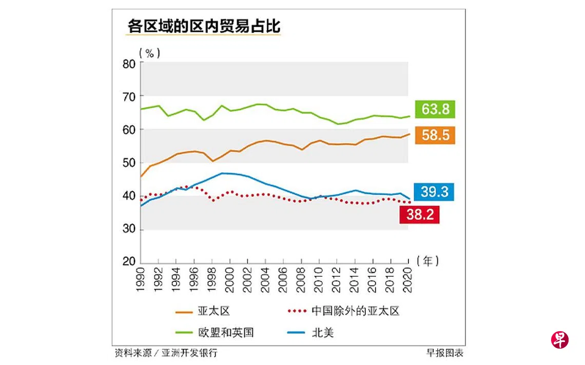 虽然冠病疫情仍未消退,但亚太区内各经济体之间的贸易额稳健增长,占亚太经济体全球贸易总额的58.5%,高于2019年的57.5%,是1990年以来的最高。这比北美州的区内贸易占比(39.3%)高,但低于欧洲和英国(63.8%)。