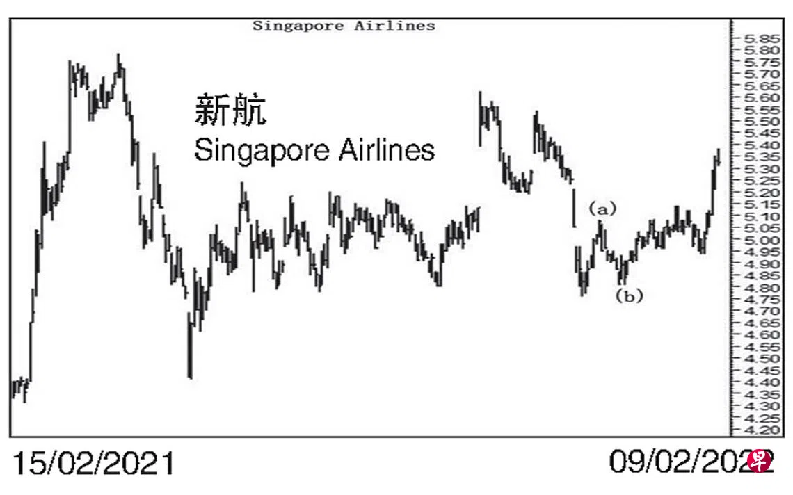 本栏于去年12月2日曾论及这只股票由于跌势甚骤,造成介于5.21元与5.25元及介于4.97元与5.05元间出现缺口。估计只要位于4.27元的颠倒“头肩形”颈线能坚守,股价当随时回升填补上述第二及第一个缺口。当时股价为4.80元左右。12月1日股价下试4.76元,接着以三波回扯。12月9日股价上升至5.08元,遂将上述第二个缺口填补,并完成了图中的(a)波。12月14日股价下试4.91元,由于跌势甚急,造成介于4.95元与4.96元间出现缺口。12月20日股价一度下探4.81元,过后又于其每周一杆图以“转向”信号结束了(b)波,12月28日股价上升至5.00元,旋将上述第三个缺口填补。今年元月5日股价升试5.08元,遂以“主要转向”信号回落。元月11日股价下跌至4.96元,且第三度试此价位未果,随即以“主要转向”信号重返升势。元月18日股价上升至5.14元,2月7日股价更升至5.29元,旋将上述第一个缺口填补,截至2月9日股价已经上升至5.38元,估计一旦穿上位于5.62元的阻力点,股价当扬长而去。