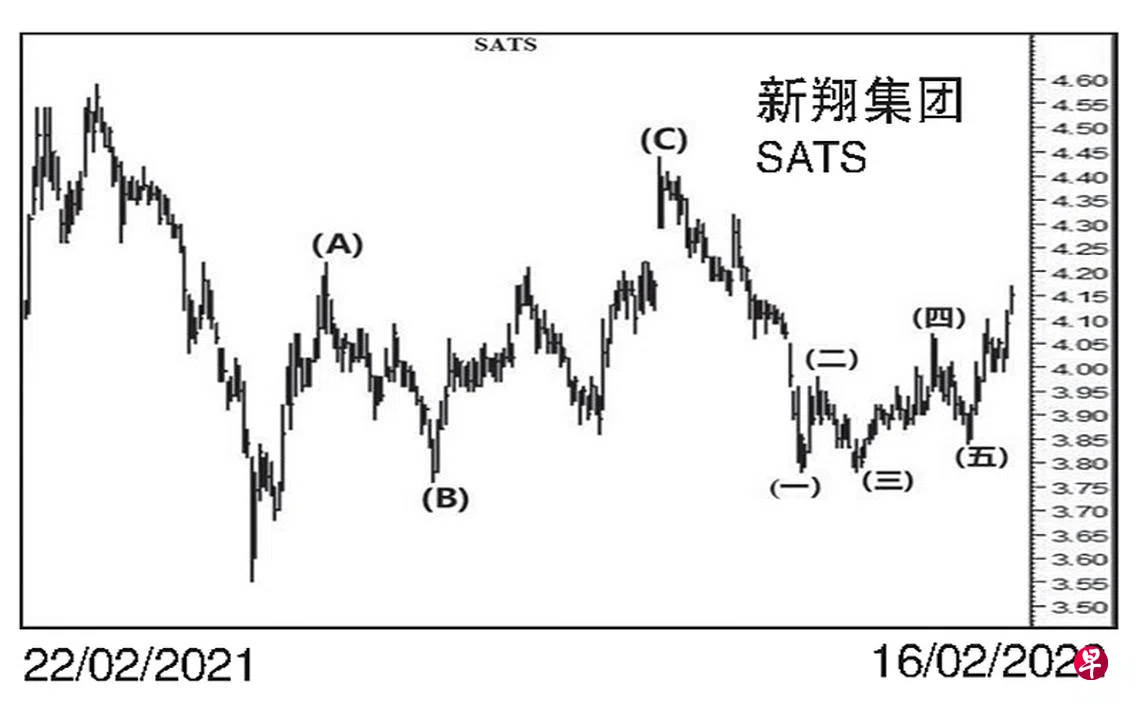 本栏于去年9月10日曾论及这只股票的“动力”信号随时会跌穿“中性线”而进入负号界域。迄时当带领股价跌穿位于3.92元的“三角形”下限。当时股价为3.97元左右。可是股价过后仅下跌至9月20日的3.86元,次日,就跳空直试4.10元,同时于该周每周一杆图以“主要转向”信号止跌回升。10月5日股价升试4.22元,6日再试此价位未果,旋以“转向”信号回落至8日的4.12元。11日股价骤然上升至4.44元,由于股价已经升逾4.22元的阻力点,因此,原先“三角形”的布局遂变成了图中的(A)、(B)及(C)三波回扯走势。而(C)波又具三细波,所以,股价于上述10月11日完成了(C)波后,重返跌势。同年12月1日股价下试3.78元,并于当天以“转向”信号形成一个升势“斜向交叉”,今年元月17日股价一度升试4.07元结束了图中的第(四)点,元月28日股价下跌至3.84元完成了第(五)点。若以图中的第(三)与第(四)点价差的1.618倍,计自第(五)点,可测得基本目标为4.31元。