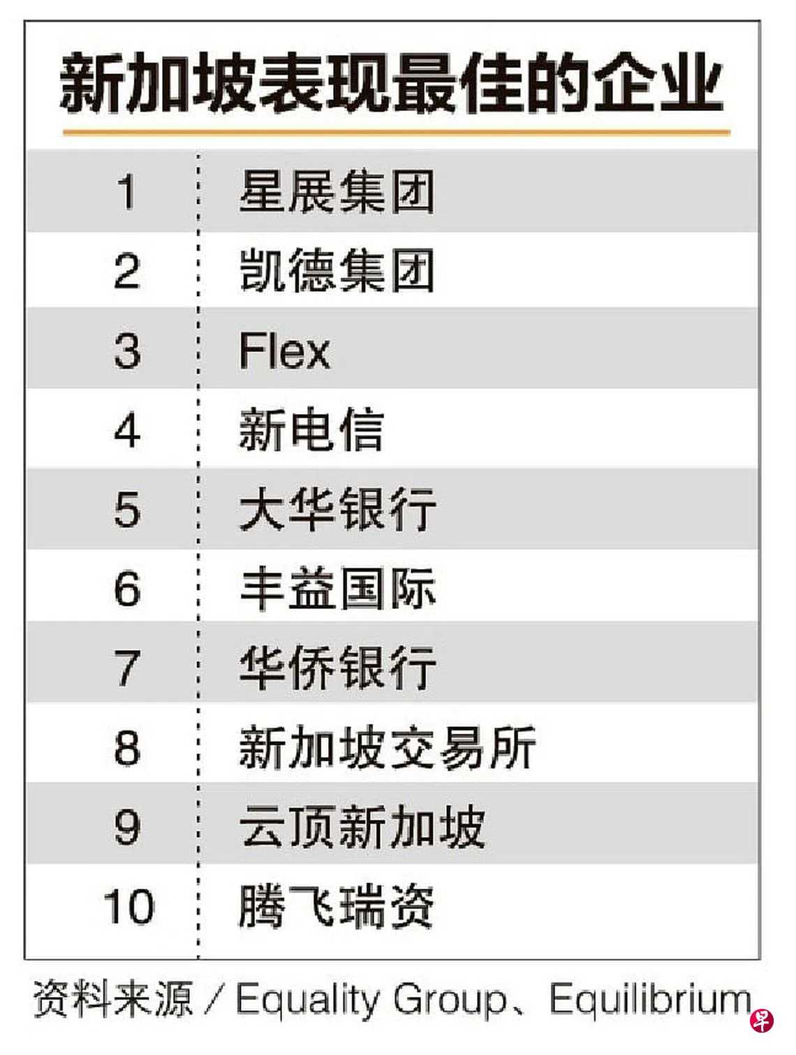 本地表现最佳的首10家企业还有凯德集团(CapitaLand)、新电信(Singtel)和大华银行(UOB)等。