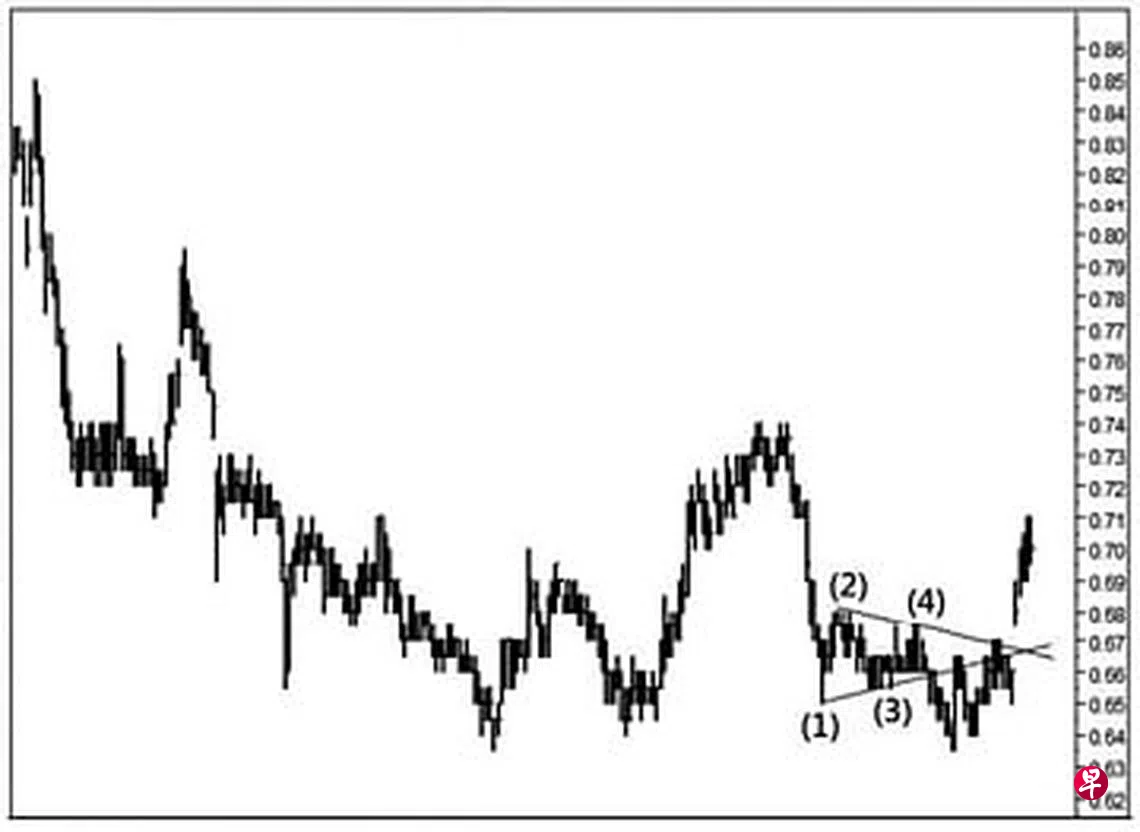 本栏于去年12月18日曾论及这只股票短期回扯当填补介于0.69元与0.695元的缺口;不过,倘若失守0.56元的重大支撑点,那将重返跌势。当时股价为0.665元左右。可是股价并没有立即回扯,而是渐渐下滑,22日股价第三度试0.655元未果,遂于当天以“转向”信号完成了左图中跌势“三角形”的第(3)点,过后回升至12月29日的0.675元。今年元月6日股价第三度试0.675元未果,随即于当天以“转向”信号结束了第(4)点。11日股价终于跌穿位于0.66元的“三角形”下限,直试0.65元,接着渐渐滑落至元月19日的0.635元;20日股价再试此价位未果,旋以“主要转向”信号回升至0.665元,且开始形成一个小型的升势“斜向交叉”。2月15日股价跳空上升至0.69元。同时在介于0.675元与0.66元间留下缺口。16日股价骤升至0.70元,又在介于0.685元与0.68元间留下缺口。截至18日股价已经上升至0.71元,估计短期回扯也只能填补上述二缺口,过后当填补介于0.73元与0.735元的缺口,并在突破0.74元的价位后,挑战位于0.85元的阻力点。