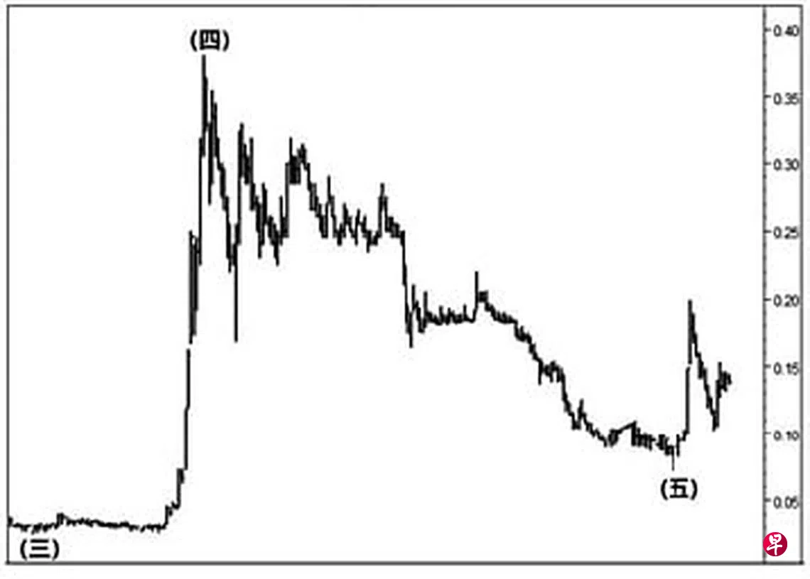 这只股票自2004年元月16日上升至0.32元后,就进入三大波下调走势。2006年8月18日股价下试0.042元完成了A大波,随后回扯至2007年4月18日的0.16元,此为B大波,旋进入具五波走势的C大波跌势。2010年2月17日股价下跌至0.035元结束了第(1)波,随即回扯至同年11月29日的0.078元,并于其每周一杆图以“主要转向”信号完成了第(2)波。2016年7月29日股价下试0.013元结束了第(3)波,接着回扯至2018年元月18日的0.045元,此为第(4)波。2019年8月15日股价下探0.01元,且于其每月一杆图以“主要转向”信号完成了第(5)波,遂止跌回升,同时形成一个升势“斜向交叉”。2020年9月7日股价上升至0.057元结束了图中的第(二)点,旋向下回扯至2021年3月11日的0.026元,此为第(三)点。同年6月11日股价骤升至0.38元完成了第(四)点,今年元月25日股价下探0.072元,并于当天以“转向”信号结束了第(五)点。估计股价已经进入升势,一旦突破位于0.26元的阻力线,股价将挑战0.38元的价位了。