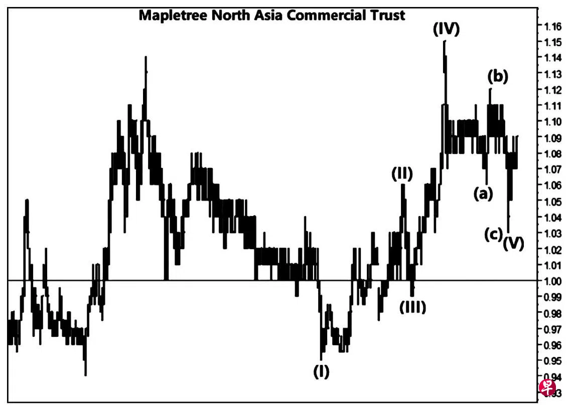 本栏于去年11月6日曾论及这只股票在10月25日结束了一个升势“斜向交叉”的第(五)点。若以图中第(三)及第(四)点价差的1.618倍,计自第(五)点,可测得短期目标为1.09元。当时股价为1.01元左右。见报当天股价虽然一度下滑至0.98元,可是却没有改变其上升的渠道。11月24日股价上升至1.06元,次日,再试此价位未果,旋出现回扯。同年12月2日股价回落至0.99元完成了一个更大型升势“斜向交叉”的第(III)点。12月27日股价升试1.11元完成了上述位于1.09元的基本目标。今年元月3日股价跳空直试1.15元结束了图中的第(IV)点,遂在介于1.13元与1.11元间留下缺口;元月4日股价回落至1.08元立即将此缺口填补。2月8日股价下试1.06元结束了图中的(a)波,过后回扯至2月10日的1.12元,此为(b)波。2月24日股价下探1.03元完成了(c)波,同时为第(V)点画下句号。若以图中第(III)与第(IV)点价差,计自1.03元,可测得基本目标为1.19元了。