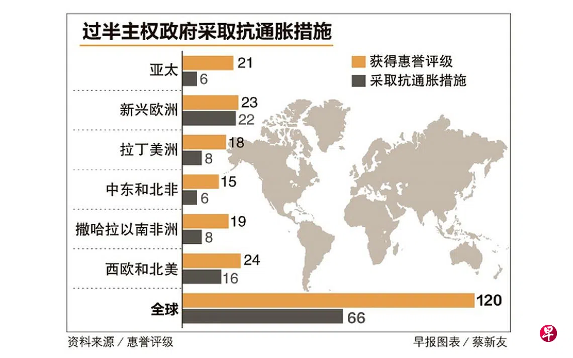 全球信用评级机构惠誉(Fiting Ratings)周一发布报告说,冠病疫情和俄乌危机的冲击下,许多国家面临价格上涨的压力,去年中到今年2月期间,机构提供评级的120个主权政府中,超过一半(66个)采取了临时措施来应付通胀对家庭的影响。