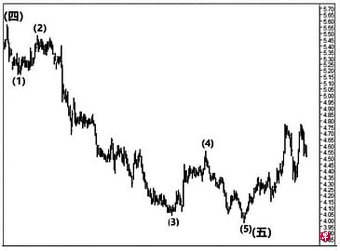 本栏于去年10月29日曾论及这只股票于9月22日股价下试4.04元完成了第(5)波,同时为一个“斜向交叉”的第(五)点画下句号,随即止跌回升,且守住了3.95元的支撑点。若以其第(三)与第(四)点的价差,计自第(五)点,可测得基本目标为5.66元了。当时股价为4.40元左右。实际上,上述的4.04元应为源自去年2月19日从5,57元下调以来的第(3)波,过后回扯至同年11月3日的4.56元,并于当天以“转向”信号完成了第(4)波,遂渐渐下滑。11月26日股价跳空下试4.22元,旋在介于4.31元与4.32元间留下缺口。12月22日股价下探3.98元,与上述3.95元的支撑点近在咫尺,遂于每周一杆图以“转向”信号结束了第(5)波,同时为升势“斜向交叉”中的第(五)点画下句号,立即止跌回升。今年元月7日股价上升至4.34元,填补了上述第一个缺口,截至2月15日股价已经上升至4.77元;短期回扯,股价或将尝试填补介于4.46元与4.45元间的缺口,过后当朝5.60元的基本目标前进。