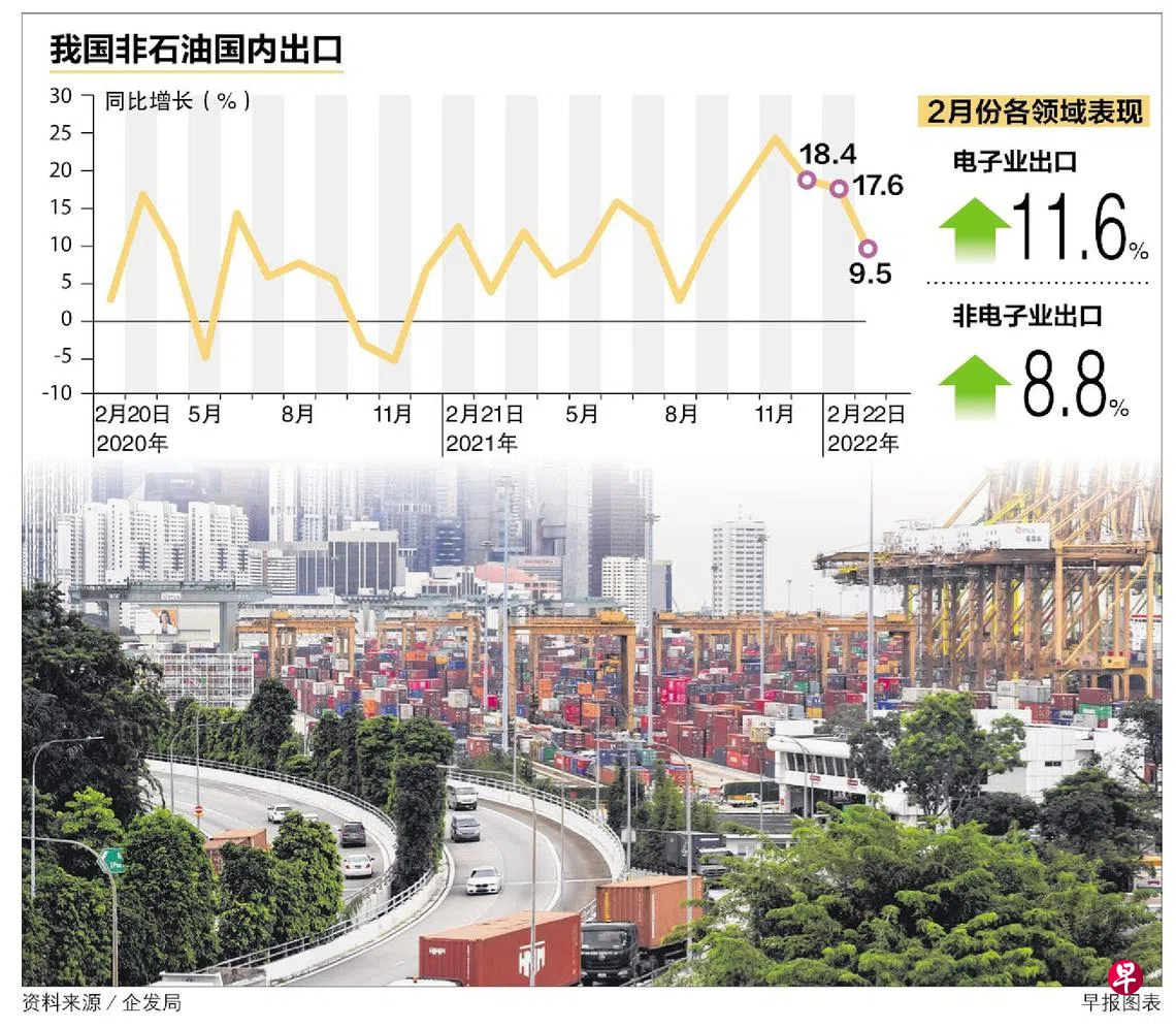 9.5%的增长远低于市场预期的16.5%,也比前一个月的17.6%来得逊色。分析师认为,上个月的出口表现让人大跌眼镜,主要是地缘政治紧张局势加剧,影响了市场需求。接下来,俄乌战争及中国冠病疫情给市场带来更多不确定性,预料将让我国出口面对多重逆风。
