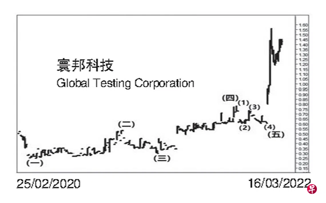 本栏于去年11月13日曾论及这只股票自2020年5月4日的0.25元上升以来,一个升势“斜向交叉”已经悄悄的形成。估计股价随时会完成第(四)点,过后进入第(五)点回扯以填补介于0.505元与0.345元间的缺口后,重返升势。当时股价为0.60元左右。12月3日股价跳空上升至0.77元,同时在介于0.67元与0.62元间留下缺口。12月8日股价更升试0.78元完成了图中的第(四)点。由于其每月一杆图中的“动力”信号已经穿上“中性线”进入到正号界域的0.89498处;因此,股价仅能以一个“三角形”替代了第(五)点回扯。12月17日股价下跌至0.605元完成了图中的第(2)点,今年元月5日股价回升至0.735元,此为第(3)点。2月24日股价回扯至0.605元结束了第(4)点,随即出现骤升。2月28日股价跳空上升至0.95元,由于升势甚骤,造成介于0.80元与0.605元间出现一个大缺口。3月3日股价终于升试1.56元,旋于当天以“转向”信号进入调整。估计股价将在0.97元左右完成回扯,过后重返升势。